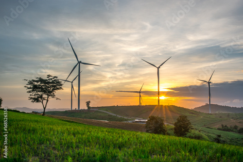 Wind generators turbines at sunset. Beautiful mountain landscape with wind generators turbines at Khao Kho mountain, Thailand. Renewable energy concept.
