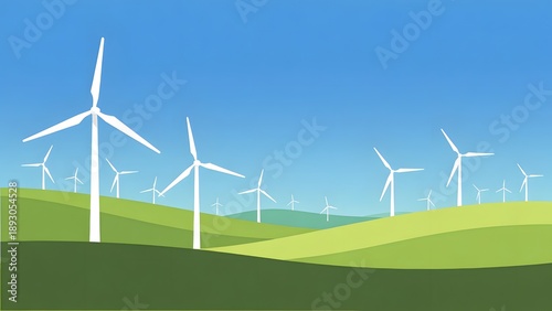 Wind turbine landscape illustration showing rolling green hills under a blue sky in a bright vector render