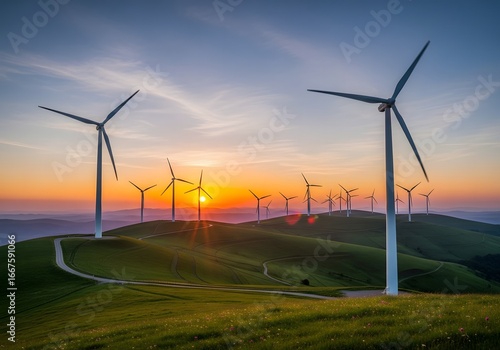 Wind turbine landscape on green hills with orange sky, a symbol of an eco-friendly future