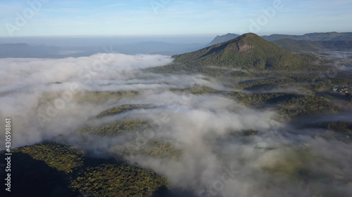 Wind turbine montait valley in mist