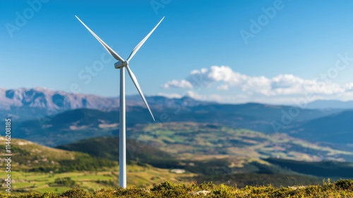 wind turbine, renewable energy, clean energy, green energy, mountain landscape, mountain, hill, nature, scenery, environment, ecology, power generation, alternative energy, wind power, energy production, electricity, landscape, photorealistic, detailed, sky, cloud, blue skies, rural, countryside, conservation, sustainability, windmill, energy