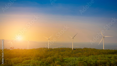 wind turbine or windmill is alternative energy and green technology with beautiful sunset sky and tree on a the mountain and landscaping shot photo, with copy space.