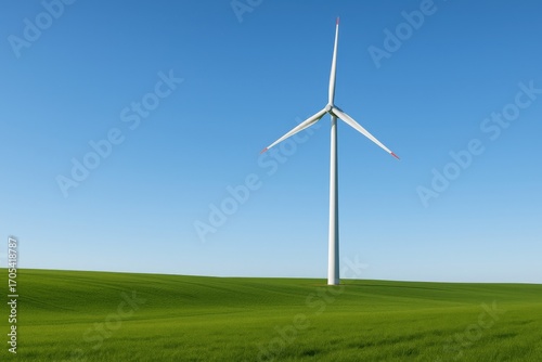 Wind turbine stands tall in vibrant green landscape under clear blue sky