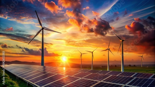 Wind turbines and solar panels glowing in the colorful sunset sky, renewable energy