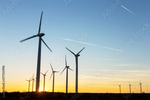 Wind Turbines at Dusk. Landscape sunset with windmills. Renewal source of electricity. Wind turbines field new technology for clean energy on mountain, sunset view with colorful twilight on sky