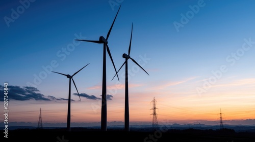 Wind turbines at sunset, energy production, rural landscape