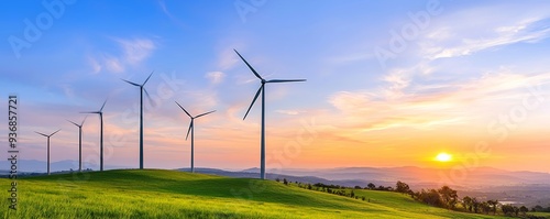 Wind turbines on a green hill at sunset, symbolizing renewable energy and sustainable development