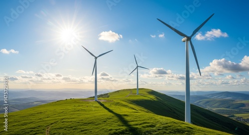 wind, energy, renewable, green, hill, hilltop, grass, sky, blue, sun, bright, cloud, landscape, mountain, distant, view, power, electricity, clean, sustainable, technology, environment, ecology, nature, outdoors, scenic, horizon, turbine, blade, generation, alternative, future, innovation, climate, change, conservation, resource, ecological, friendly, countryside, meadow, field, pastoral, peaceful, serene, calm, quiet, fresh