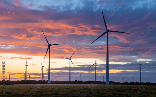renewable energy, sunset, sky, nature, technology, sustainable, environment, wind power, clean energy, landscape, dusk, cloud, scenic, horizon, agriculture, power generation, electricity, outdoors, evening, silhouette, windmill, colorful sky, field