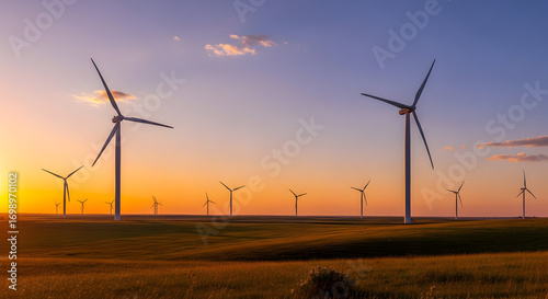 Wind turbines stand tall against a vibrant sunset sky over a grassy field