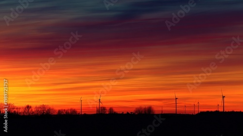 sunset, wind, power, energy, sky, orange, red, silhouette, horizon, landscape, nature, renewable, generation, electricity, field, evening, dusk, dawn, colourful, atmosphere, outdoors, scene, background, industrial, technology, apparatus, machine, equipment, structure, tower, blade, rotation, movement, clean, green, eco, friendly, sustainable, future, progress, development, scenic, beauty, vibrant, dramatic, huge, open, rural