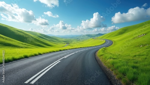 Winding asphalt road curves through green rolling hills under bright blue sky with scattered clouds. Empty countryside highway offers sense of freedom, endless journey into horizon. Perfect for