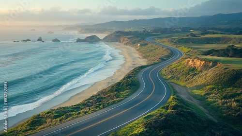 road, coast, ocean, beach, sunset, sky, cloud, cliff, horizon, water, wave, sand, green, grass, land, landscape, nature, scenic, view, travel, journey, destination, highway, asphalt, hillside, curve, winding, gold, blue, mountain, hill, rock, tree, foliage, perspective, aerial, picturesque
