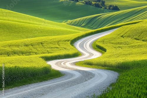 Winding dirt road through vibrant green fields on a sunny day in the countryside