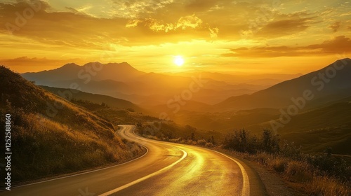 sunset, road, mountain, winding, scenic, view, landscape, nature, travel, adventure, highway, journey, summer, gold, horizon, cloud, sky, sun, dusk, light, hill, peak, path, asphalt, curve, way, drive, freedom, exploration, relaxation, vacation, serenity, calm, peace, beauty, picturesque, background, image, photo, picture, graphic