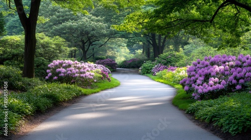park, path, rhododendron, garden, landscape, nature, spring, flower, blooming, tree, greenery, scenery, tranquil, peaceful, serene, vibrant, colourful, beauty, outdoors, sunlight, shadow, curve, winding, paseo, blossom, flora, botanical, idylli, picturesque, springtime, morning, environment