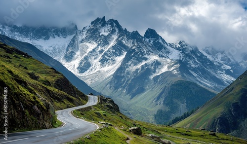 road, winding, french, alps, mountain, snow, peak, majestic, towering, overcast, sky, dramatic, landscape, scenic, nature, alpine, travel, journey, adventure, elevation, winter, rugged, route, drive, wilderness, panorama, beauty, cloud, terrain, exploration, mountain, summer, vale, peak, grass, view, tour tourism, hill, glacier, hiking