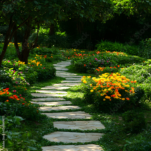 Winding Stone Path Through a Colorful Flower Garden