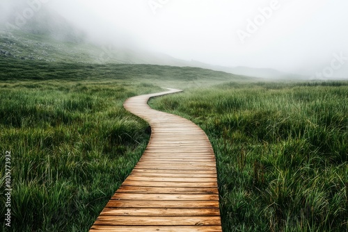 path, wooden, winding, misty, foggy, grass, field, green, nature, landscape, scenery, summer, meadow, tranquil, peaceful, serene, quiet, calm, relaxing, journey, travel, destination, adventure, perspective, direction, way, forward, hope, dream, wanderlust, exploration
