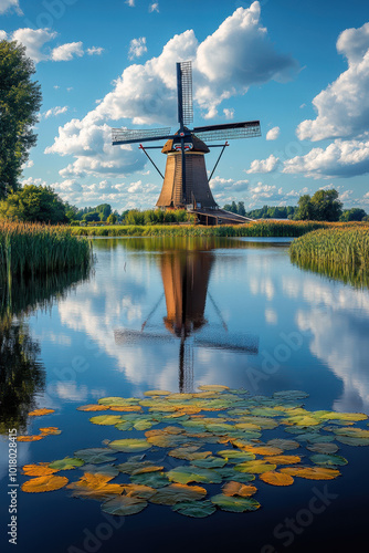 Windmills, blue sky with clouds, river with lily pads and reeds.