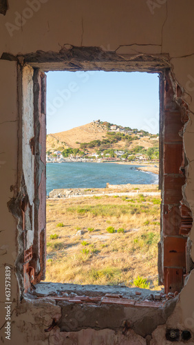 Window to the sea in an abandoned house across to Kalekoy sea town. The Aegean sea town view from window. Gokceada, Imbros island, Canakkale.