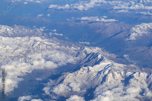 Window view from an airplane on the snow capped mountain ranges of the Alps at the border Austria Italy, Europe, EU. High peak are shrouded in clouds. Flying high above the ground. Freedom