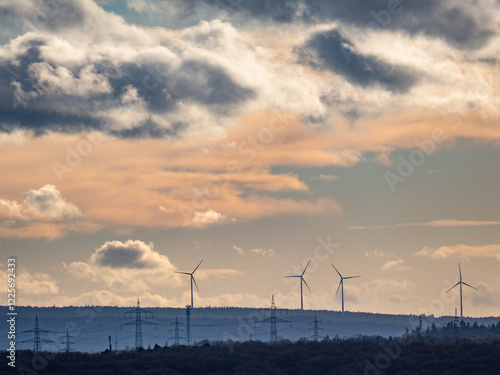 windmill, stream, renewable, wind farm, energy, horizon, pylon, technology, electricity, forest, architecture, sunset, heaven, black forest, orange