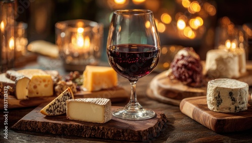 Wine and cheese arrangement on rustic wooden surfaces with soft, ambient lighting creating a warm, inviting atmosphere