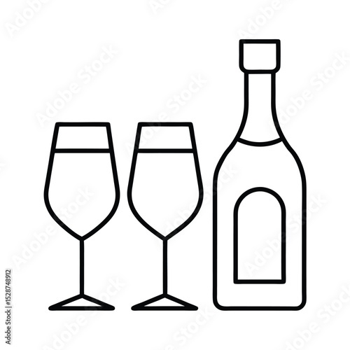 Wine bottle and two glasses line drawing illustration