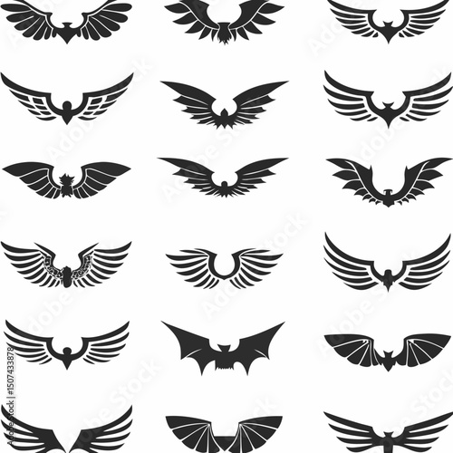 Wing logo designs, vector wing set. Artistic wing illustrations including eagle, angel, bird, bat, and minimalist icons for tattoos, emblems, branding, or fantasy-themed projects.