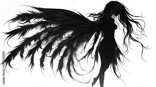 woman, wing, angel, silhouette, dark, black, feather, fantasy, beauty, mysterious, elegant, aethereal, mystic, divine, light, shadow, female, art, design, illustration, drawing, artistic, concept, graceful, angelic, mythical, goddess, raven, creature, spirit, gothic, magical, dreamlike, surreal, symbolic, powerful, serene, floating, weightless, freedom, imagination, transformation, delicate, captivating, enchanting, alluring