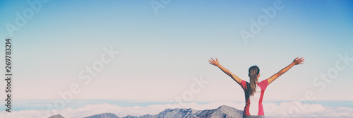 Winning success banner woman reaching summit goal with arms up in the air panorama. Blue sky background. Girl living her life to the fullest fulfilling her dreams - bucket list concept.
