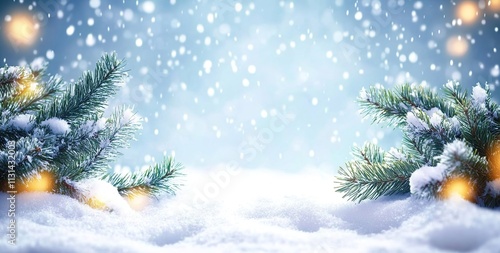 Winter background with snow and fir branches, glowing bokeh lights.