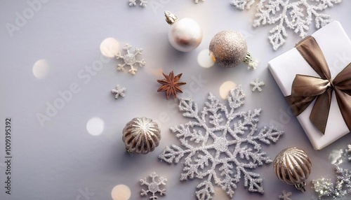 Winter banner and layout, gift and toys snowflakes scattered on bright background, space for text. Christmas, holiday and greetings concept