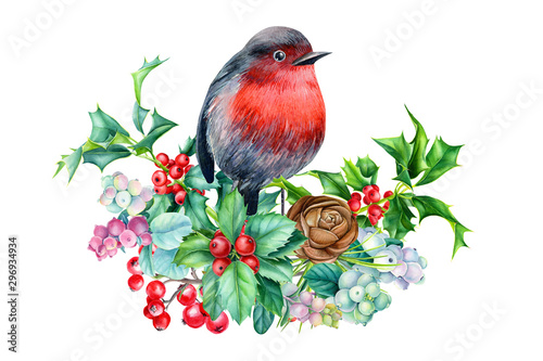 Winter beautiful birds robin watercolor on a white background, christmas composition of holly, snowberries. New year holiday