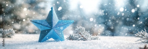 Winter decoration with a blue star and snowflakes on a snowy landscape background . ai