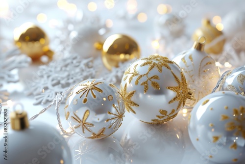 Winter holiday Festive white and gold Christmas ornaments and baubles. Empty glass snowball isolated on white background, AI-generated