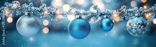 Winter Holiday Scene with Blue Silver Ornaments and Snowflake Garland