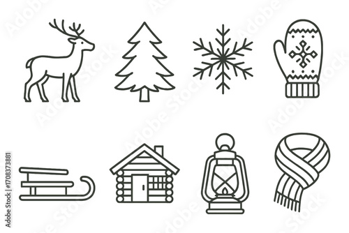 winter, icon, set, cervid, tree, snowflake, mitten, sled, cabin, lantern, foulard, illustration, cold, season, cosy, nature, silhouette, decoration, holiday, rustic, design, forest, festive, element, traditional, simple, outline, graphic, warm, skiing, alpine, wood, fireplace, filed, adventure, decor, charme, snow, frost, celebration, warmth, shelter, knit up