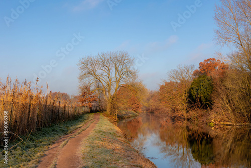 Winter landscape view of white frost in morning, Nature path along the Kromme Rijn river (Crooked Rhine) in Rhijnauwen, Bunnik is a municipality and a village in the province of Utrecht Netherlands.