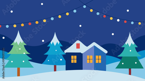 christmas, winter, snow, house, landscape, tree, holiday, christmas, village, vector, night, illustration, season, card, sky, celebration, snowflake, home, cold, town, scene, new year, decoration, cartoon, snowman
