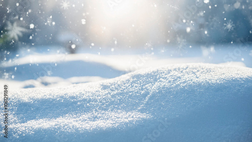 Winter landscape with falling snowflakes and snow drifts. Christmas background with copy space