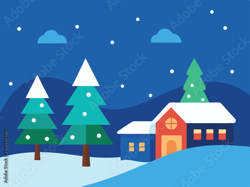 christmas, winter, snow, house, landscape, tree, christmas, holiday, village, vector, season, illustration, home, cartoon, scene, snowflake, night, celebration, cold, sky, card, decoration, nature, new, forest