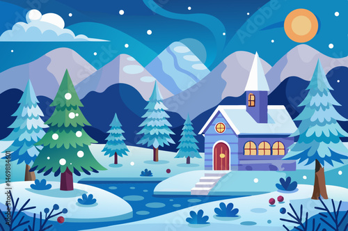 christmas, winter, snow, house, landscape, tree, christmas, holiday, season, vector, village, illustration, home, cartoon, card, celebration, scene, snowflake, cold, night, nature, decoration, snowman, forest, bungalow