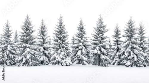 Winter landscape with pine trees covered in snow on white background