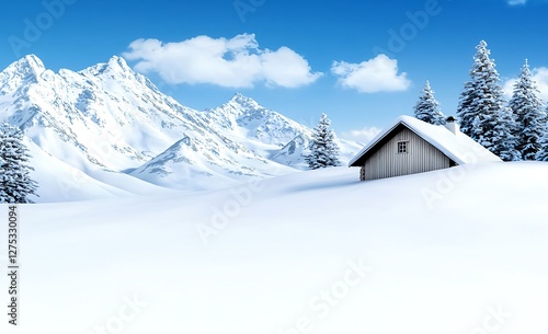 Winter Landscape with Snow-Covered Mountains and Cozy Cabin