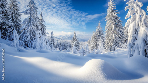 Winter landscape with snow-covered trees and a bright blue sky in a serene mountain setting