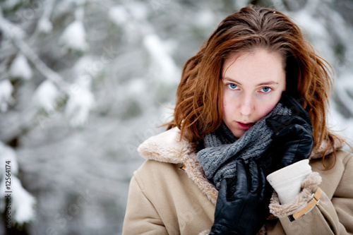 adorable, beautiful, beauty, blue eye, caucasian, cold, confident, copy space, eye contact, female, friendly, jacket, long hair, portrait, shawl, snow, tempting, white, winter, woman, young adult