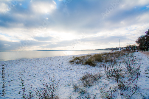 Winter Landschaft Ostsee Meer Eckernförde Norddeutschland Strand Himmel Wolken Menschen Spaziergänger Dünen