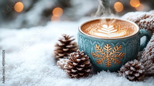 latte, hot drink, winter, snow, pine cone, cosy, christmas, holiday, winter scene, beverage, hot drink, seasonal, christmas decoration, snow-covered, snowflake, decorative, festive